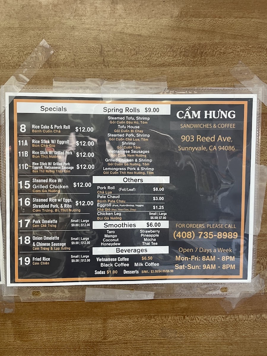 Cẩm Hưng Sandwich and Coffee is a hidden gem tucked away at 903 Reed Ave in Sunnyvale, offering authentic Vietnamese flavors through a humble, no-frills setting. This mom-and-pop shop specializes in bánh mì—a Vietnamese sandwich that balances crispy, fresh baguettes with tender, flavorful fillings. The bread here stands out as a true highlight, praised by many for its perfect crunch and freshness, rivaling some of the best baguettes found anywhere in the Bay Area.